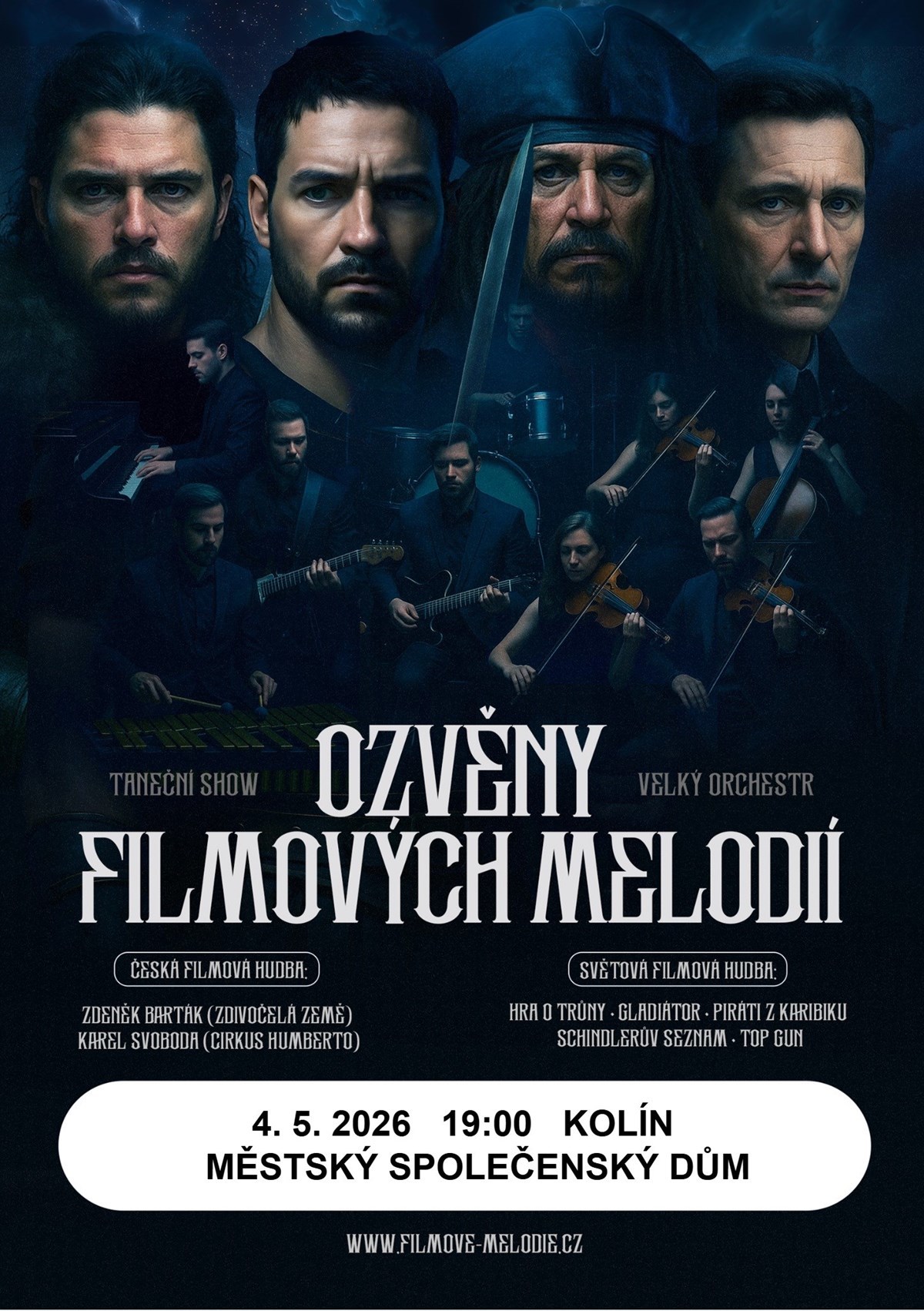 Těšit se můžete na hudbu z filmů Gladiátor, Interstellar, Piráti z Karibiku, Schindlerův seznam, Harry Potter, Hodný, zlý a ošklivý, Zdivočelá země, Noc na Karlštejně, Cirkus Humberto a mnoha dalších.