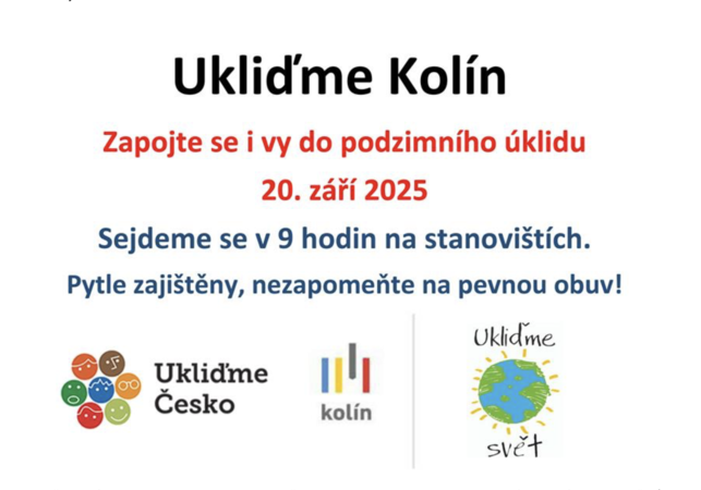 V sobotu 20. 9. 2025 se uskuteční dobrovolnická úklidová akce s názvem Ukliďme Kolín. Jejím cílem je zbavit česká města, vesnice a přírodu volně odhozeného nepořádku a černých skládek a zároveň upozornit na dlouhodobě neřešenou problematiku černých skládek.